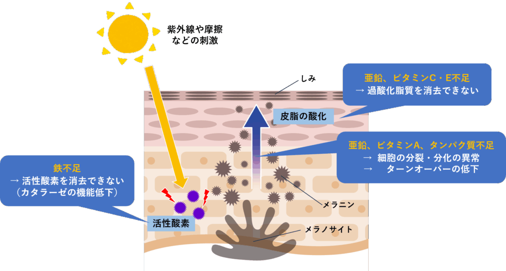 不足すると、活性酸素や酸化された皮脂がメラニン産生を過剰に促し、しみやくすみの原因になります。