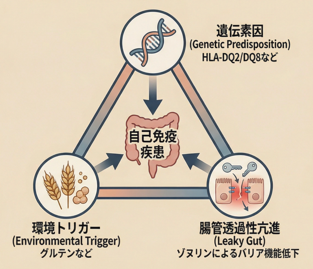 3つが揃わないと自己免疫疾患は発症しない。逆に言えば、環境トリガーを除去するか腸のバリア機能を守ることで、遺伝的リスクがあっても発症を防げる可能性がある。