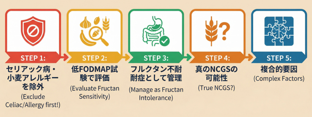 STEP 4:真のNCGSの可能性 FODMAP除去でも改善しない場合に、真の非セリアックグルテン感受性を検討する。