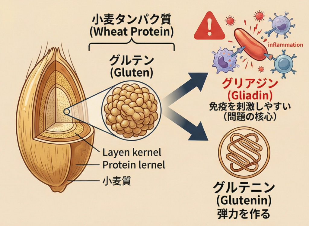 問題の核心は「グリアジン」だ。腸管免疫を刺激し、セリアック病・非セリアックグルテン感受性(NCGS)・自己免疫疾患と関連する。消化されにくい構造を持つため、腸内で厄介なことを起こしやすい。