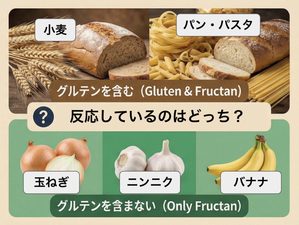 グルテンフリーにして「小麦を抜く」と、グルテンもフルクタンも同時に減る。だから良くなる。でも原因がどちらかは分からない。