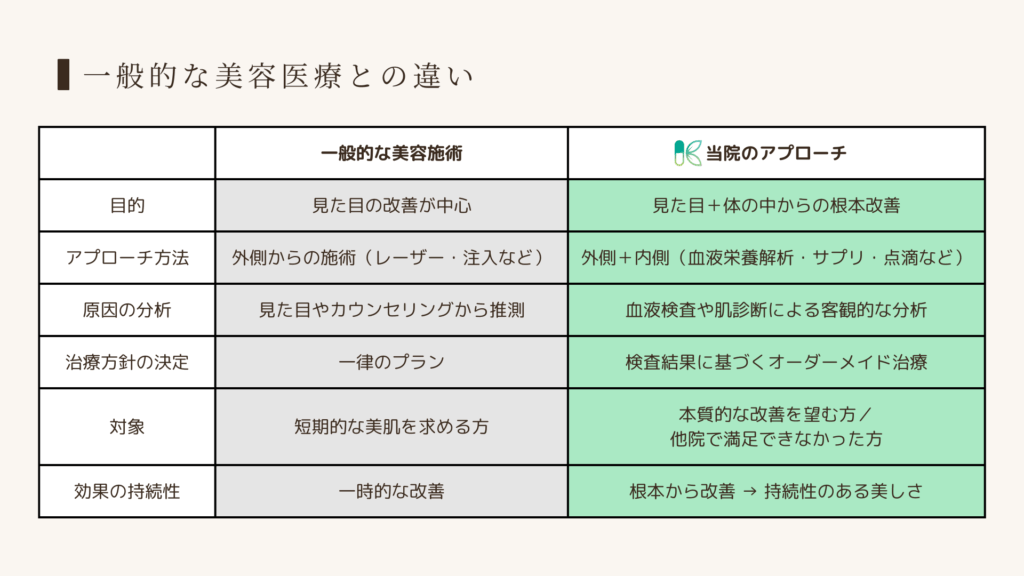 一方、美容皮膚科の多くはレーザーやピーリングといった外からの施術に強みを持ちます。