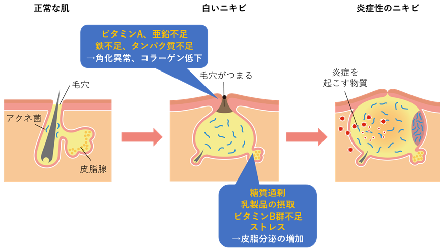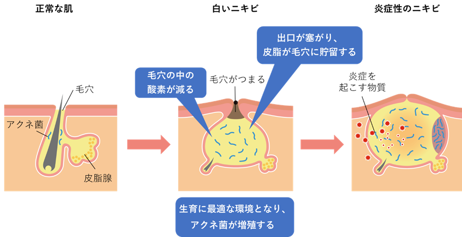 一般的には、「毛穴がつまること」「皮脂分泌が増加すること」により、毛穴の中でアクネ菌が過剰に増殖し、炎症を引き起こすことが原因と考えられています。