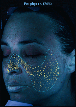 VISIAでは、皮膚の表面にあるポルフィリン(ニキビ菌の代謝物)の量を解析することで、ニキビの状態やニキビができやすい状態になっているかどうか、皮脂分泌が増加しているかどうかを客観的に評価します。