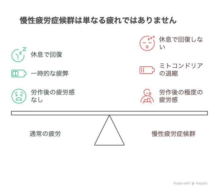 普通の疲れは休息で回復しますが、慢性疲労症候群の疲労は休んでも改善しません。これは体が「緊急省エネモード(冬眠状態)」に入ったまま戻れなくなっているためです。