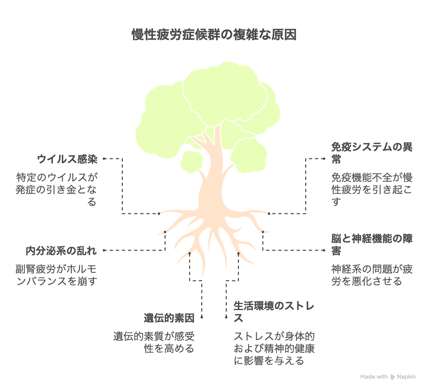 慢性的なだるさの背景には、複数の要因が複雑に絡み合っています。ウイルス感染をきっかけに発症するケースが多く、特にエプスタイン・バーウイルスやヘルペスウイルスなどとの関連が指摘されています。また、免疫システムの異常、副腎疲労による内分泌系の乱れ、脳や神経機能の障害、さらには遺伝的素因や生活環境のストレスなども関与していると考えられています。単一の原因ではなく、多因子が関わる複雑な病態です。