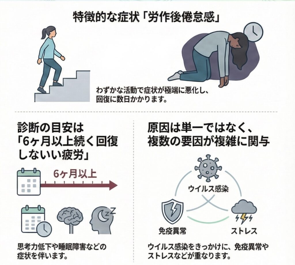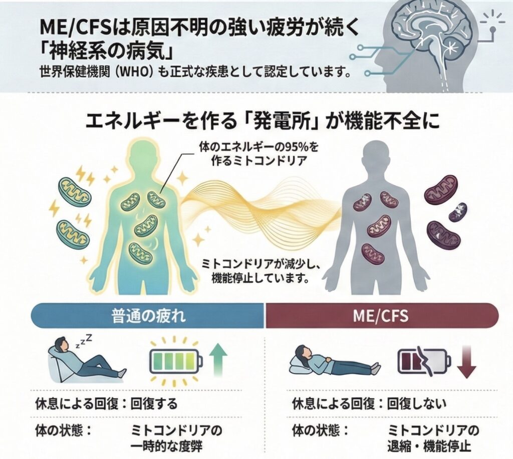 医学的にはME/CFSと表記され、世界保健機関(WHO)の国際疾病分類でも神経系疾患として認められています。単に疲れやすいという状態ではなく、日常生活や社会生活に深刻な影響を及ぼす疾患として位置づけられています。
