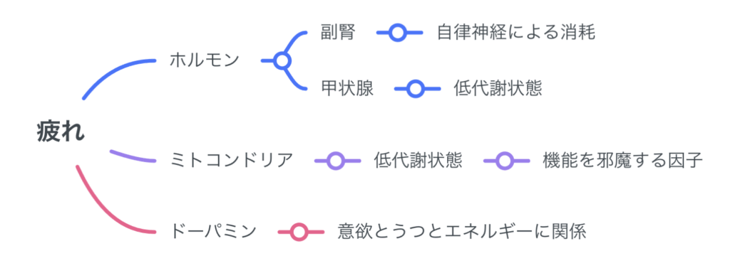 副腎は「ストレス対応ホルモン」であるコルチゾールを分泌する臓器です。慢性的なストレス、血糖調節障害、慢性炎症により副腎が疲弊すると、ストレス処理能力が低下し、朝起きられない、夜眠れない、立ちくらみなどの症状とともに慢性疲労を呈します。