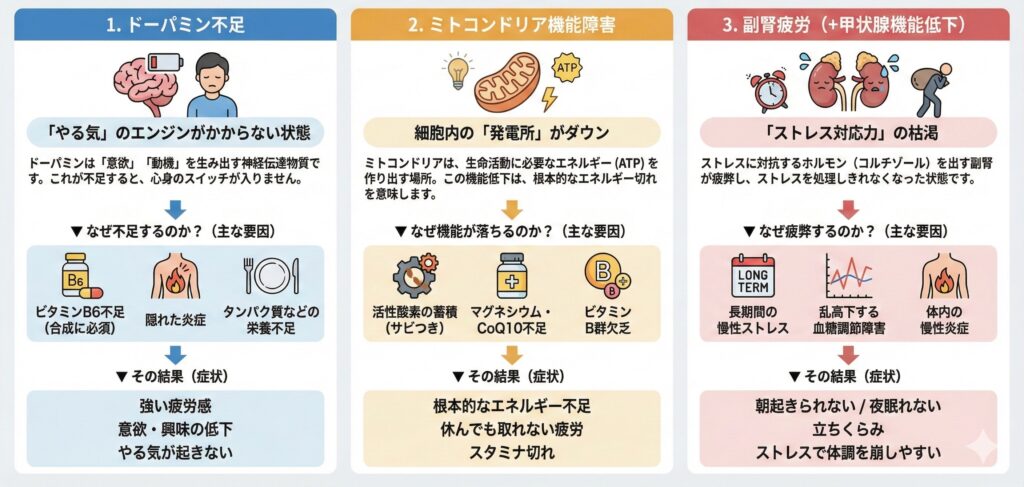 ドーパミンは「やる気」や「動機」に関わる神経伝達物質です。ビタミンB6不足や、慢性的なストレス、栄養不足により、ドーパミンの合成が低下すると、疲労感や意欲低下を引き起こします。