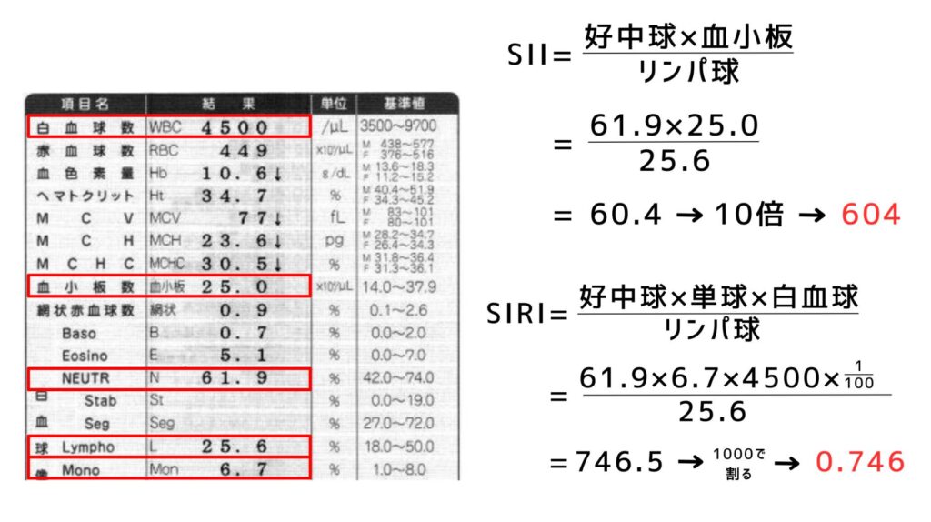 SII(好中球x血小板/リンパ球)x10、SIRI(白血球x好中球x単球/リンパ球)/100,000 を表示する。