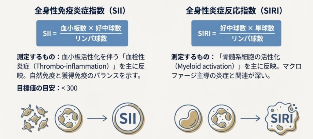 SIIは特に血管系の炎症を、SIRIは自己免疫が関わる炎症を反映します。